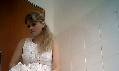 Fine curvaceous blonde lady in white dress filmed in the toilet bedroom