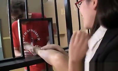 Lady agent in stockings gives footjob
