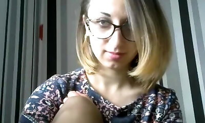 Lovely blond busty teen camgirl in glasses on webcam