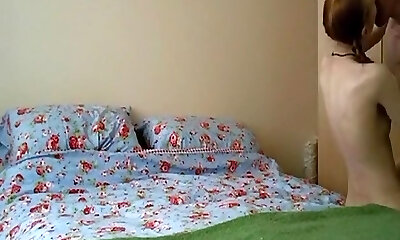Anorexia pigtailed redhead girl has missionary, doggy style and cowgirl sex with creampie on the bed.